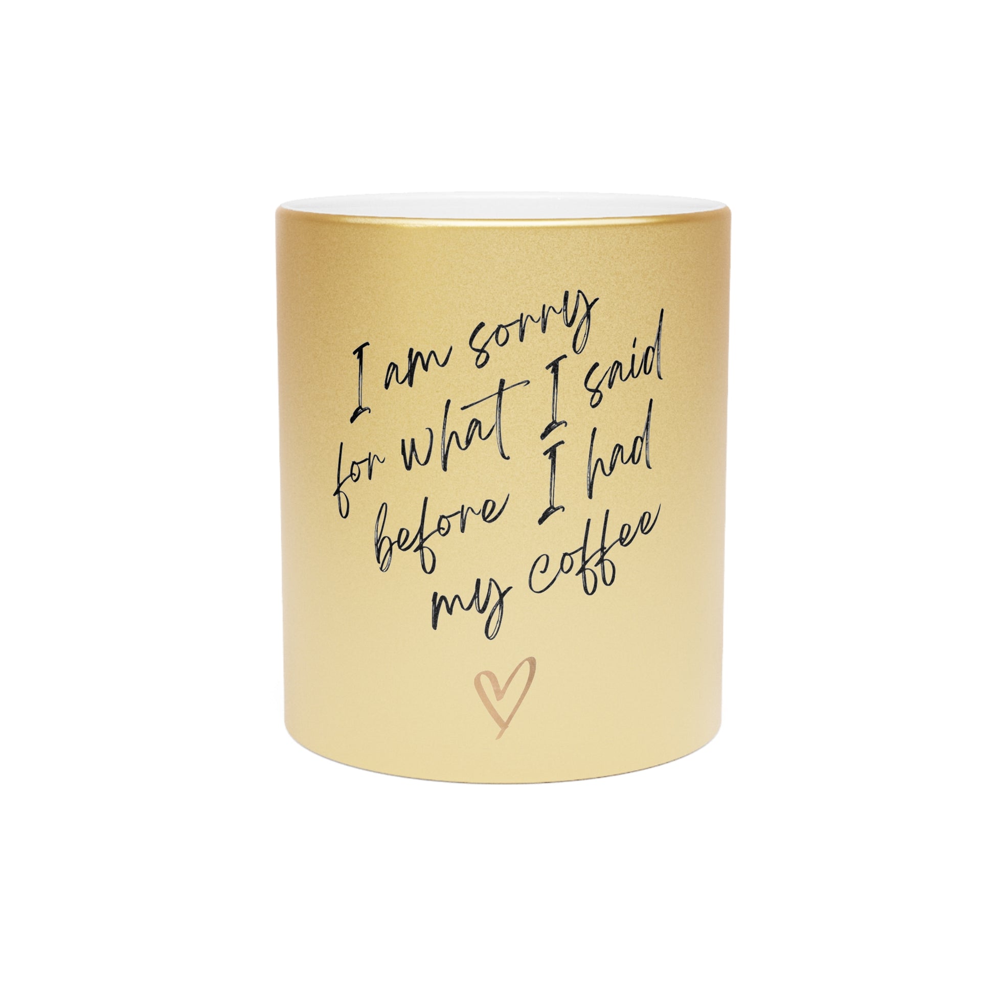Metallic Mug (Silver\/Gold) that states, I am sorry for what I said before I had my coffee. This mug brings a touch of elegance with its Gold or Silver metallic coating. Perfect for coffee lovers who need their morning caffeine fix before interacting with others. Ideal for gift-giving on birthdays, Mother's Day, Father's Day, or as a Christmas stocking stuffer.